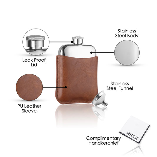HIPLE® 6oz Stainless Steel Hip Flask Gift Set with Tan Leather Sleeve, Free Hankie and Funnel